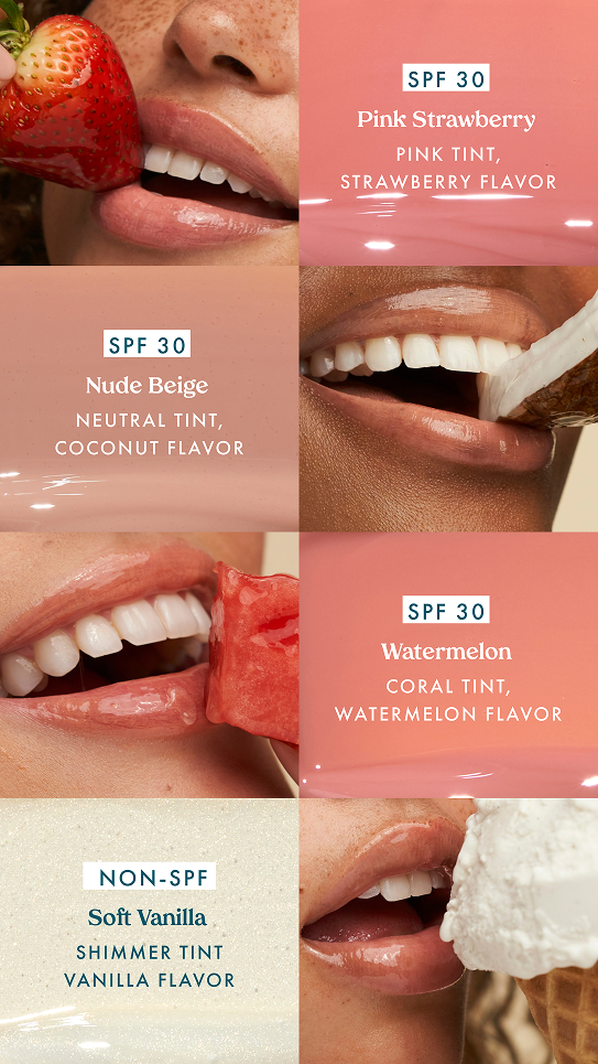 Pucker up for paradise. Lip Love wraps your lips in a soft swirl of moisture with a ceramide-led formula that hydrates, smooths, and protects. This set includes four sheer, juicy shades - including three 100% mineral SPF 30 shades (Pink Strawberry, Watermelon, Nude Beige) and one non-SPF Soft Vanilla shimmer. No SPF taste, no sticky feel - just irresistibly soft, nourished lips that stay sweet all day.