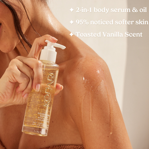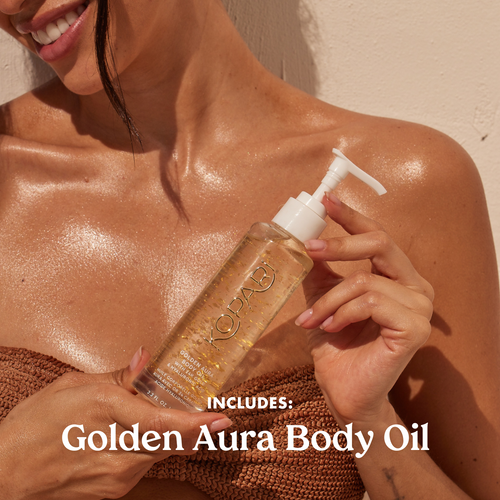 Golden Aura Body Oil: Helianthus Annuus Seed Oil, C12-15 Alkyl Benzoate, Butyrospermum Parkii Oil, Parfum, Caprylic/Capric Triglyceride, Cocos Nucifera Oil, Tocopherol, Glycine Soja Oil, Squalane, Ricinus Communis Seed Oil, Gold, Sodium Hyaluronate, Hydrogenated Castor Oil, Benzyl Alcohol, Coumarin, Hexyl Cinnamal, CI 77820, CI77400