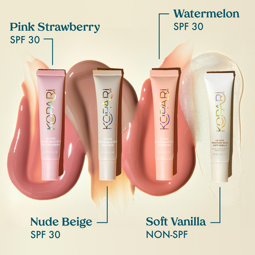 Pucker up for paradise. Lip Love wraps your lips in a soft swirl of moisture with a ceramide-led formula that hydrates, smooths, and protects. This set includes four sheer, juicy shades - including three 100% mineral SPF 30 shades (Pink Strawberry, Watermelon, Nude Beige) and one non-SPF Soft Vanilla shimmer. No SPF taste, no sticky feel - just irresistibly soft, nourished lips that stay sweet all day.